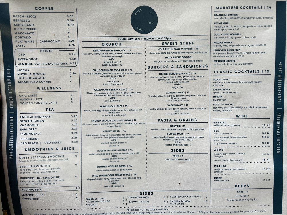 With friendly service and a hip atmosphere, Hole In The Wall promises an excellent experience for brunch enthusiasts seeking a satisfying meal in a trendy yet casual setting.